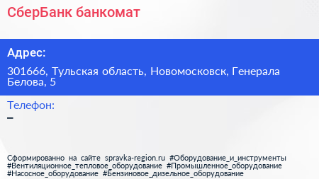 СберБанк, банкомат по адресу 301666, Тульская область, Новомосковск, Генерала Белова, 5 в дальнейшем Организация, размещена в следующих категориях: