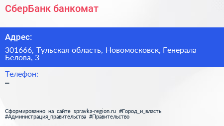 СберБанк, банкомат по адресу 301666, Тульская область, Новомосковск, Генерала Белова, 3 в дальнейшем Организация, размещена в следующих категориях: