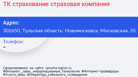 ТК-страхование, страховая компания по адресу 301650, Тульская область, Новомосковск, Московская, 35 в дальнейшем Организация, размещена в следующих категориях: