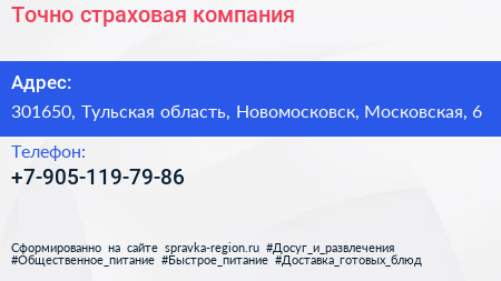 Точно, страховая компания по адресу 301650, Тульская область, Новомосковск, Московская, 6 в дальнейшем Организация, размещена в следующих категориях: