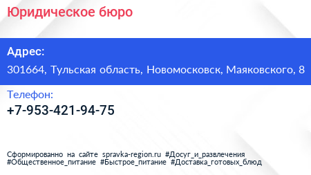 Юридическое бюро по адресу 301664, Тульская область, Новомосковск, Маяковского, 8 в дальнейшем Организация, размещена в следующих категориях:
