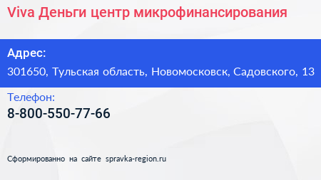 Viva Деньги, центр микрофинансирования по адресу 301650, Тульская область, Новомосковск, Садовского, 13 в дальнейшем Организация, размещена в следующих категориях: