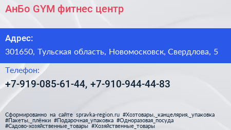 АнБо - GYM, фитнес центр по адресу 301650, Тульская область, Новомосковск, Свердлова, 5 в дальнейшем Организация, размещена в следующих категориях: