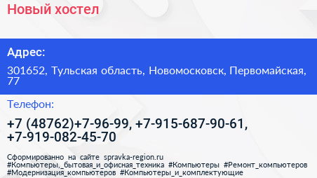 Новый хостел по адресу 301652, Тульская область, Новомосковск, Первомайская, 77 в дальнейшем Организация, размещена в следующих категориях: