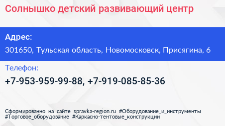 Солнышко, детский развивающий центр по адресу 301650, Тульская область, Новомосковск, Присягина, 6 в дальнейшем Организация, размещена в следующих категориях: