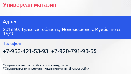 Универсал, магазин по адресу 301650, Тульская область, Новомосковск, Куйбышева, 15/3 в дальнейшем Организация, размещена в следующих категориях: