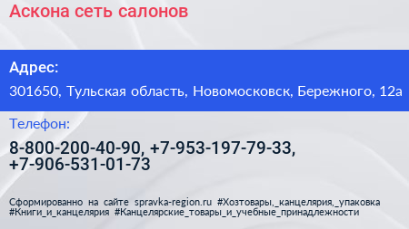 Аскона, сеть салонов по адресу 301650, Тульская область, Новомосковск, Бережного, 12а в дальнейшем Организация, размещена в следующих категориях: