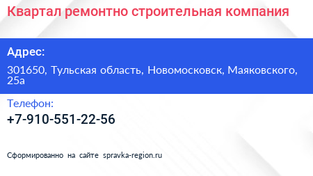 Квартал, ремонтно-строительная компания по адресу 301650, Тульская область, Новомосковск, Маяковского, 25а в дальнейшем Организация, размещена в следующих категориях: