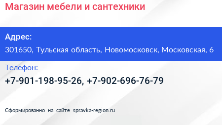Магазин мебели и сантехники по адресу 301650, Тульская область, Новомосковск, Московская, 6 в дальнейшем Организация, размещена в следующих категориях: