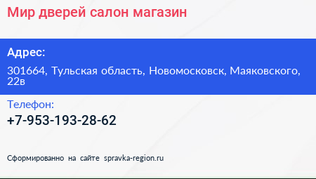Мир дверей, салон магазин по адресу 301664, Тульская область, Новомосковск, Маяковского, 22в в дальнейшем Организация, размещена в следующих категориях: