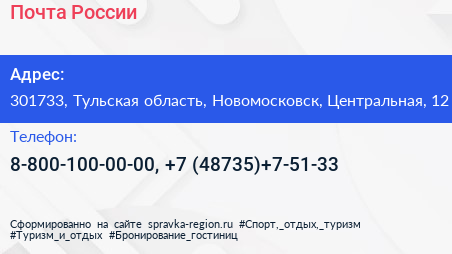 Почта России по адресу 301733, Тульская область, Новомосковск, Центральная, 12 в дальнейшем Организация, размещена в следующих категориях: