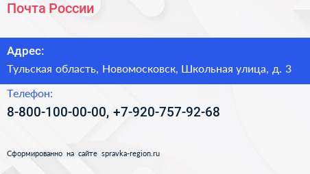 Почта России по адресу Тульская область, Новомосковск, Школьная улица, д. 3 в дальнейшем Организация, размещена в следующих категориях: