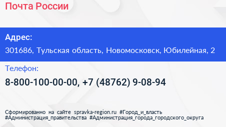 Почта России по адресу 301686, Тульская область, Новомосковск, Юбилейная, 2 в дальнейшем Организация, размещена в следующих категориях: