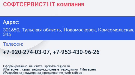 СОФТСЕРВИС71, IT-компания по адресу 301650, Тульская область, Новомосковск, Комсомольская, 34а в дальнейшем Организация, размещена в следующих категориях: