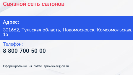 Связной, сеть салонов по адресу 301662, Тульская область, Новомосковск, Комсомольская, 1а в дальнейшем Организация, размещена в следующих категориях: