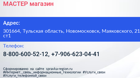 МАСТЕР, магазин по адресу 301664, Тульская область, Новомосковск, Маяковского, 21 ст1 в дальнейшем Организация, размещена в следующих категориях: