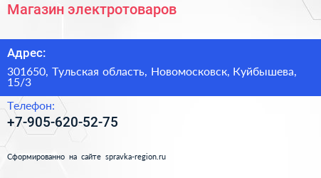 Магазин электротоваров по адресу 301650, Тульская область, Новомосковск, Куйбышева, 15/3 в дальнейшем Организация, размещена в следующих категориях: