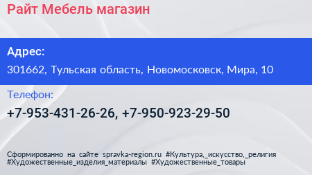 Райт Мебель, магазин по адресу 301662, Тульская область, Новомосковск, Мира, 10 в дальнейшем Организация, размещена в следующих категориях: