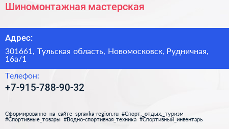 Шиномонтажная мастерская по адресу 301661, Тульская область, Новомосковск, Рудничная, 16а/1 в дальнейшем Организация, размещена в следующих категориях: