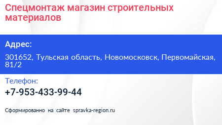 Спецмонтаж, магазин строительных материалов по адресу 301652, Тульская область, Новомосковск, Первомайская, 81/2 в дальнейшем Организация, размещена в следующих категориях: