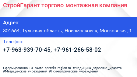 СтройГарант, торгово-монтажная компания по адресу 301664, Тульская область, Новомосковск, Московская, 1 в дальнейшем Организация, размещена в следующих категориях: