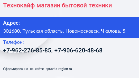 Технокайф, магазин бытовой техники по адресу 301680, Тульская область, Новомосковск, Чкалова, 5 в дальнейшем Организация, размещена в следующих категориях: