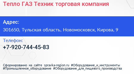 Тепло-ГАЗ-Техник, торговая компания по адресу 301650, Тульская область, Новомосковск, Кирова, 9 в дальнейшем Организация, размещена в следующих категориях: