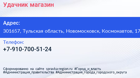 Удачник, магазин по адресу 301657, Тульская область, Новомосковск, Космонавтов, 17 в дальнейшем Организация, размещена в следующих категориях: