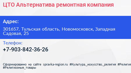 ЦТО Альтернатива, ремонтная компания по адресу 301657, Тульская область, Новомосковск, Западная Садовая, 25 в дальнейшем Организация, размещена в следующих категориях: