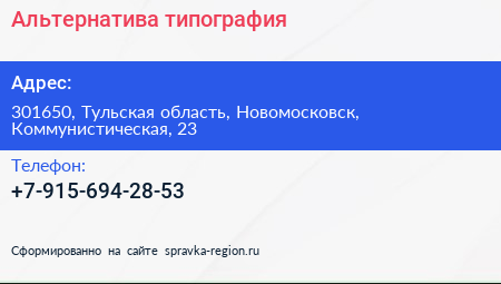 Альтернатива, типография по адресу 301650, Тульская область, Новомосковск, Коммунистическая, 23 в дальнейшем Организация, размещена в следующих категориях: