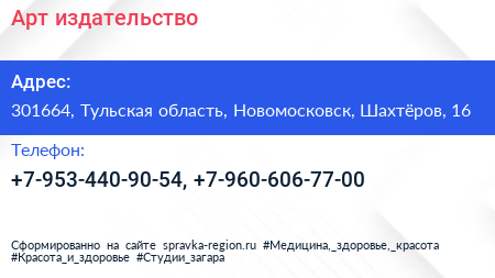 Арт, издательство по адресу 301664, Тульская область, Новомосковск, Шахтёров, 16 в дальнейшем Организация, размещена в следующих категориях: