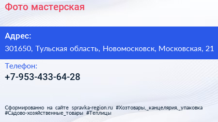 Фото мастерская по адресу 301650, Тульская область, Новомосковск, Московская, 21 в дальнейшем Организация, размещена в следующих категориях: