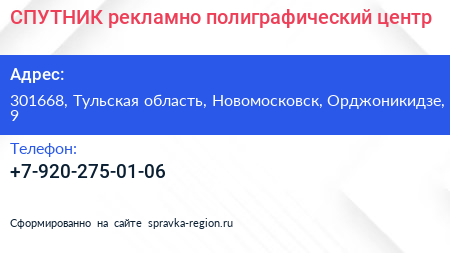 СПУТНИК, рекламно-полиграфический центр по адресу 301668, Тульская область, Новомосковск, Орджоникидзе, 9 в дальнейшем Организация, размещена в следующих категориях: