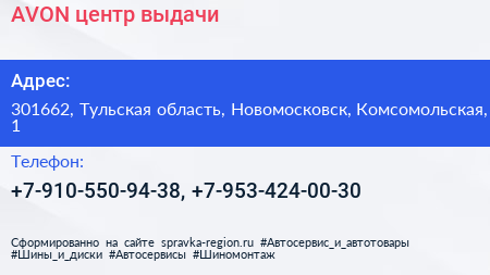 AVON, центр выдачи по адресу 301662, Тульская область, Новомосковск, Комсомольская, 1 в дальнейшем Организация, размещена в следующих категориях: