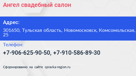 Ангел, свадебный салон по адресу 301650, Тульская область, Новомосковск, Комсомольская, 25 в дальнейшем Организация, размещена в следующих категориях:
