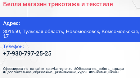 Белла, магазин трикотажа и текстиля по адресу 301650, Тульская область, Новомосковск, Комсомольская, 17 в дальнейшем Организация, размещена в следующих категориях: