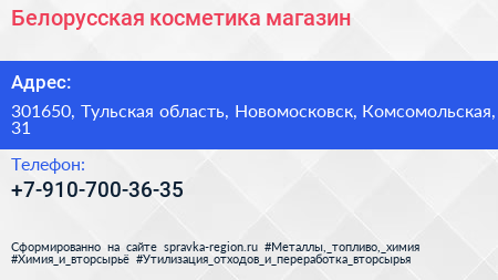 Белорусская косметика, магазин по адресу 301650, Тульская область, Новомосковск, Комсомольская, 31 в дальнейшем Организация, размещена в следующих категориях: