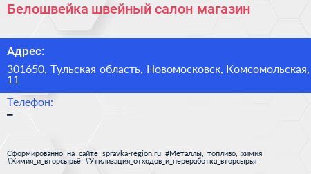 Белошвейка, швейный салон-магазин по адресу 301650, Тульская область, Новомосковск, Комсомольская, 11 в дальнейшем Организация, размещена в следующих категориях:
