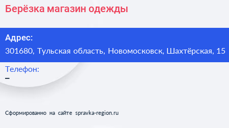 Берёзка, магазин одежды по адресу 301680, Тульская область, Новомосковск, Шахтёрская, 15 в дальнейшем Организация, размещена в следующих категориях: