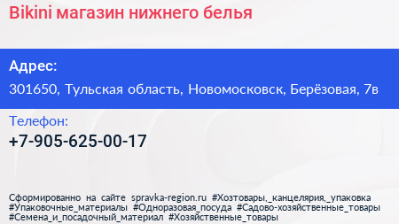 Bikini, магазин нижнего белья по адресу 301650, Тульская область, Новомосковск, Берёзовая, 7в в дальнейшем Организация, размещена в следующих категориях: