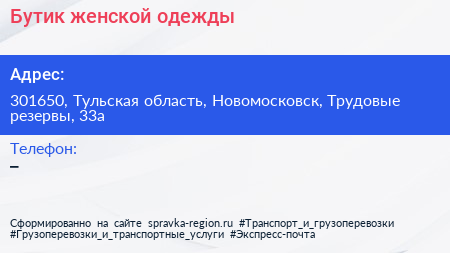 Бутик женской одежды по адресу 301650, Тульская область, Новомосковск, Трудовые резервы, 33а в дальнейшем Организация, размещена в следующих категориях: