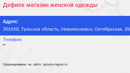 Дефиле, магазин женской одежды по адресу 301650, Тульская область, Новомосковск, Октябрьская, 28 в дальнейшем Организация, размещена в следующих категориях: