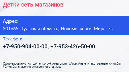 Детки, сеть магазинов по адресу 301665, Тульская область, Новомосковск, Мира, 7в в дальнейшем Организация, размещена в следующих категориях: