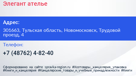 Элегант, ателье по адресу 301663, Тульская область, Новомосковск, Трудовой проезд, 4 в дальнейшем Организация, размещена в следующих категориях: