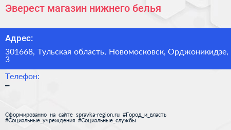 Эверест, магазин нижнего белья по адресу 301668, Тульская область, Новомосковск, Орджоникидзе, 3 в дальнейшем Организация, размещена в следующих категориях: