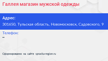 Галлея, магазин мужской одежды по адресу 301650, Тульская область, Новомосковск, Садовского, 9 в дальнейшем Организация, размещена в следующих категориях: