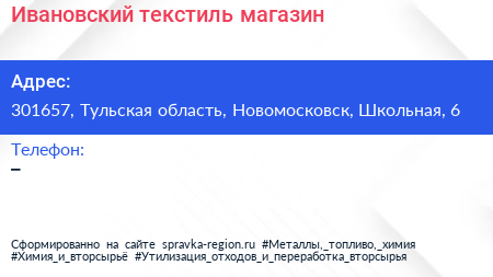 Ивановский текстиль, магазин по адресу 301657, Тульская область, Новомосковск, Школьная, 6 в дальнейшем Организация, размещена в следующих категориях: