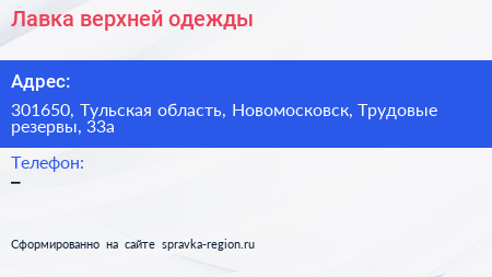 Лавка верхней одежды по адресу 301650, Тульская область, Новомосковск, Трудовые резервы, 33а в дальнейшем Организация, размещена в следующих категориях: