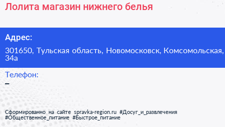 Лолита, магазин нижнего белья по адресу 301650, Тульская область, Новомосковск, Комсомольская, 34а в дальнейшем Организация, размещена в следующих категориях: