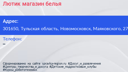 Лютик, магазин белья по адресу 301650, Тульская область, Новомосковск, Маяковского, 27 в дальнейшем Организация, размещена в следующих категориях: